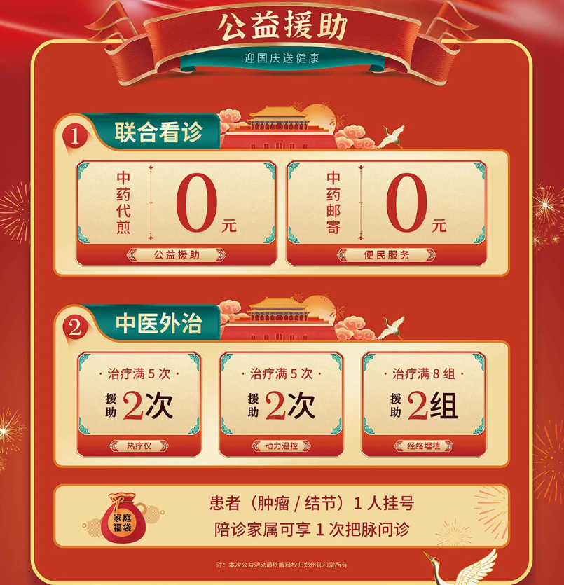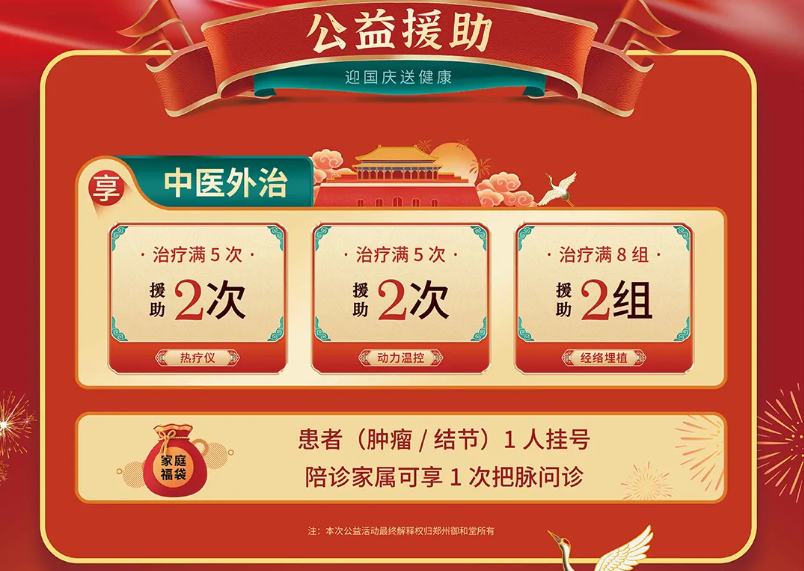 郑州御和堂中医趁国庆节来临之际,2024年9月29日—10月5日,开展“国医大师弟子领衔·中医外治护航,诊疗新模式联合看诊”公益活动,希望为众多渴望康复的患者点亮希望。我院精心策划与筹备,旨在通过汇聚名中医专家,为广大患者提供更准确、高效的诊疗方案,切实解决患者看病“有专家 没时间”,“有时间 没专家”的尴尬问题。